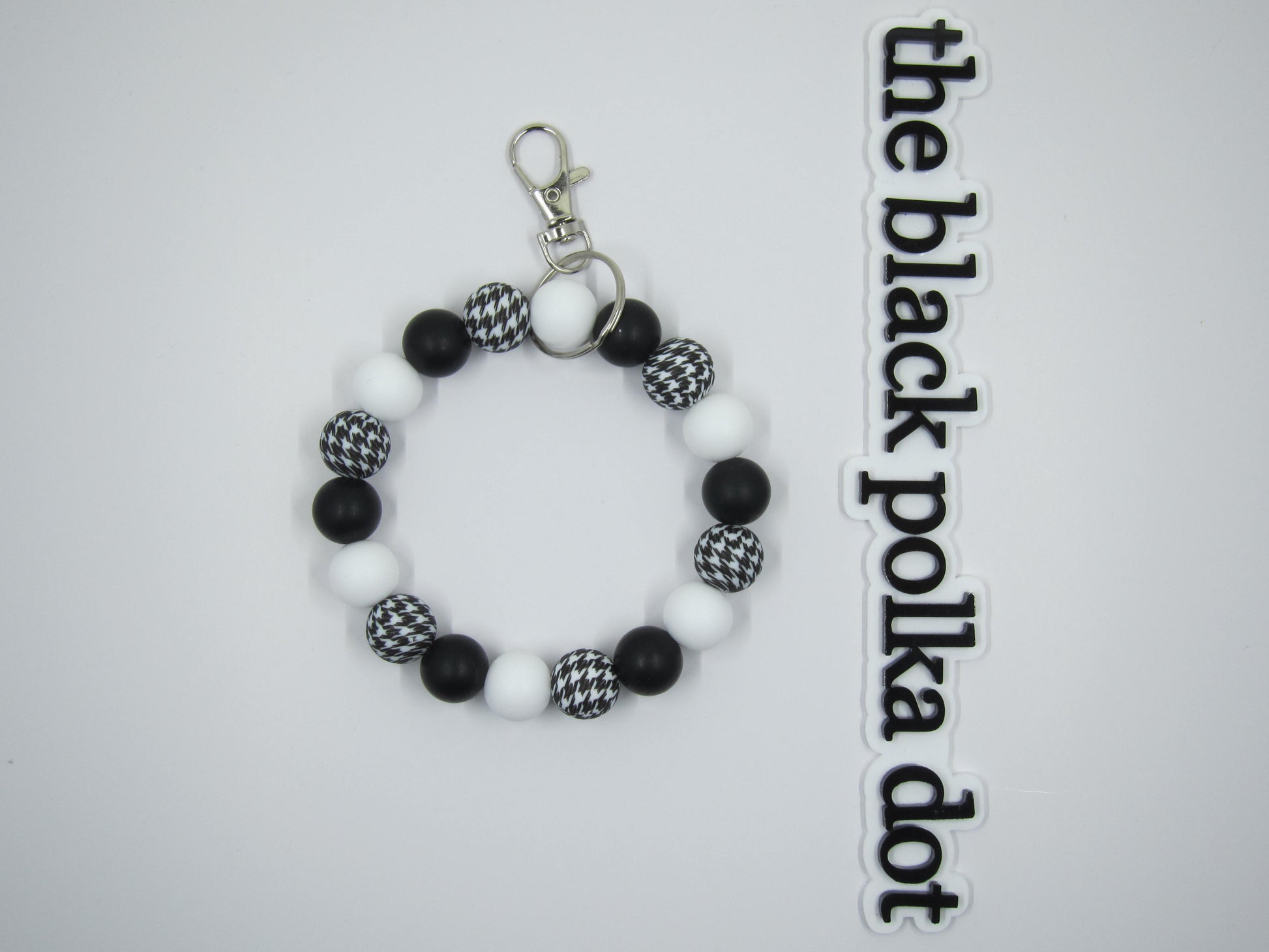 silicone beaded wristlet strung on a 10 inch stainless steel wire with attached key fob.